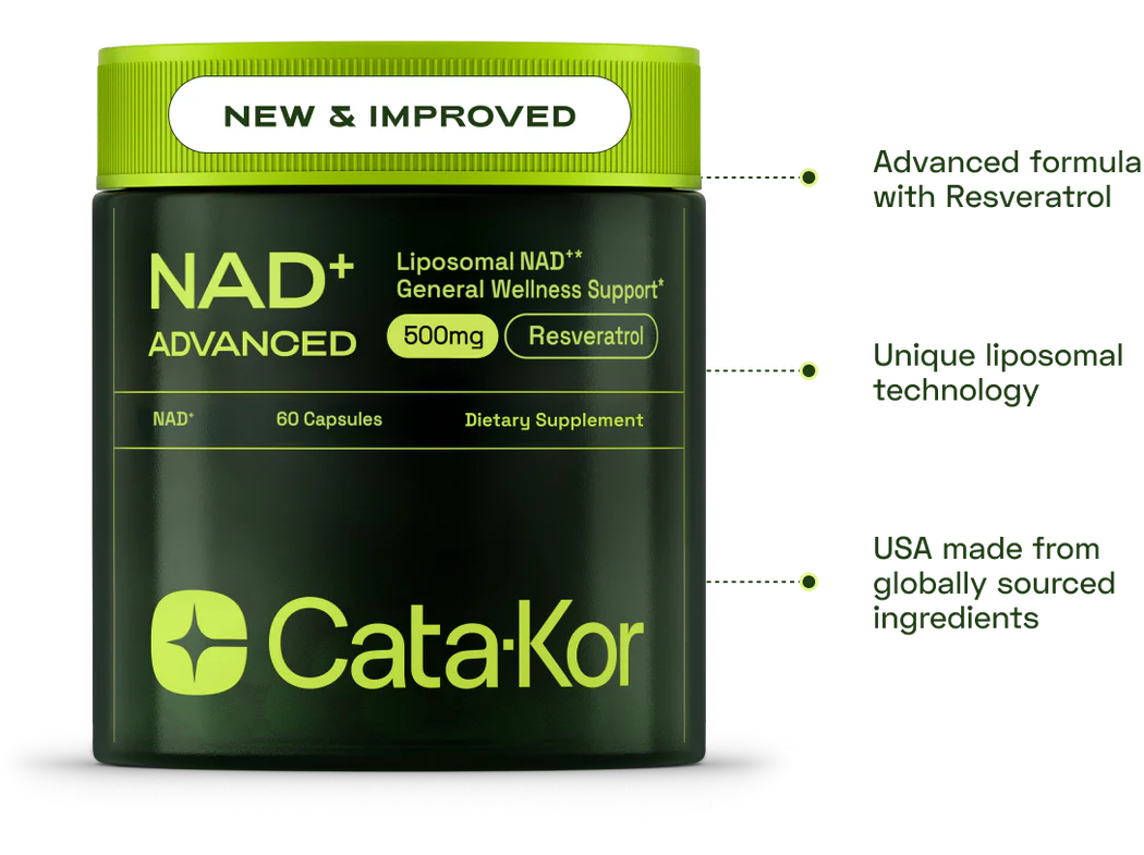 Cata-Kor’s NMN Supplement with Resveratrol, TMG and Quercetin is a high-purity NAD+ supplement designed to support cellular energy and healthy aging.